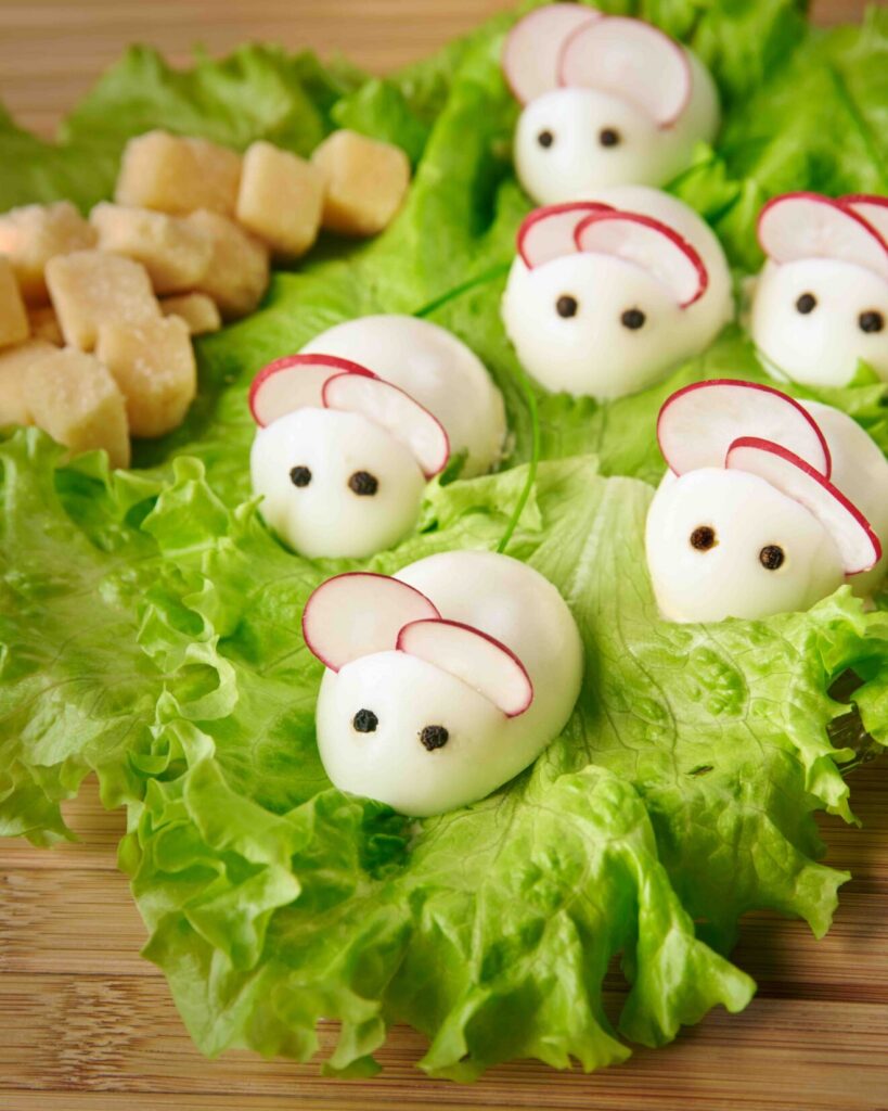2. Kata serveerimisalus salatilehtedega. Täida kõik munavalgepoolikud 1–2 tl munavõiga ja tõsta serveerimisalusele, ümar pool üleval ja täidis all. Pese redised ja lõika õhukesteks ketasteks. Tee muna kumerale poolele noaga pragu ja torka sinna kaks rediseketast kõrvadeks. Nende ette tee veel kaks sisselõiget ja pista pipraterad silmadeks. Muna tagumisele poolele säti murulaugujupp sabaks. Korda sama kõikide munadega, kuni saad viis hiirekest. Lisa serveerimisalusele veidi hiirte lemmikuid juustusnäkke ja naudi kohe.